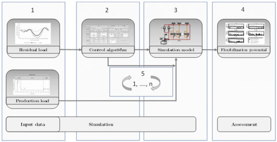 An extensive simulation study is carried out in order to quantify the flexibilisation potential of change of energy sources using the example of an injection moulding company. The simulation study is based on measured data of both plastic manufacturers and residual loads of varying grids. The general methodology of the simulation study is described below and visualised in Figure 1.