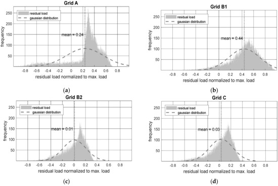 Histograms of the residual load curves. (a) Grid A photovaoltaics embossing; (b) Grid B1 photovoltaic dominated mixed embossing; (c) Grid B2 photovoltaic dominated mixed embossing; (d) Grid C wind energy dominated mixed embossing.