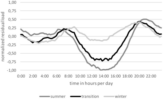 Seasonal curves of the daily residual load (averaged and normalized) of Grid B2. Transition refers to the spring and autumn months.