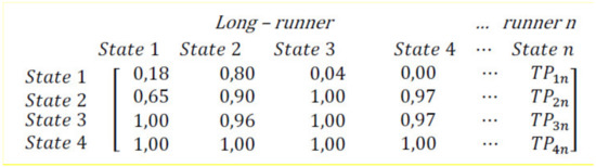 The transition probabilities indicate the change of state from state x to state y. The probabilities are set up in a transition density function for all machine types and used for random load profile generation.