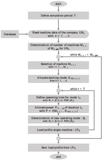 The process starts with the definition of the simulation time period, T. All relevant machine data are loaded from a database for the company UNx. The machines are allocated to runtime groups. This is followed by the determination of the number of machines in the groups (Mx,L). In the next step the load profiles are determined.