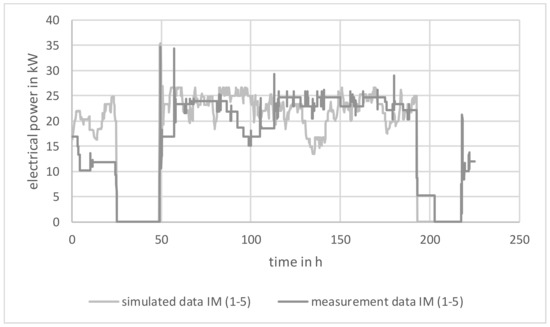A comparison of the synthetic load profiles with measurement data of five IM of a plastic packaging manufacturer shows a high correspondence. Both the lowering over the weekend and the start-up peaks are comparable (Figure 8).