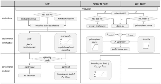 A plant schedule for the operation of all relevant system components (CHP, PtH, gas boiler) is determined the next step. A control algorithm specifies the basic operating mode of the components with regard to the residual load of the current time step (Figure 1, part 2).