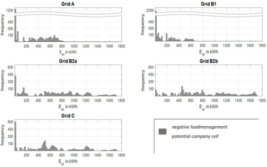Contrary to the potential shown in the case “New installation of Heating System”, the long operating times of the CHP in grid A and B1 result in a low potential. Shorter time windows for the system shutdown of the CHP units reach up to a threshold value of 800 kWh/d, which is slightly exceeded in grid A. For the remaining grids, the potential range is broadly diversified up to days on which the negative load management potential increased to a maximum possible utilisation of 1700 kWh/d. Such a high potential is justified by days on which the CHP operation is paused due to continuous renewable overfeeding of the grid areas.