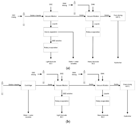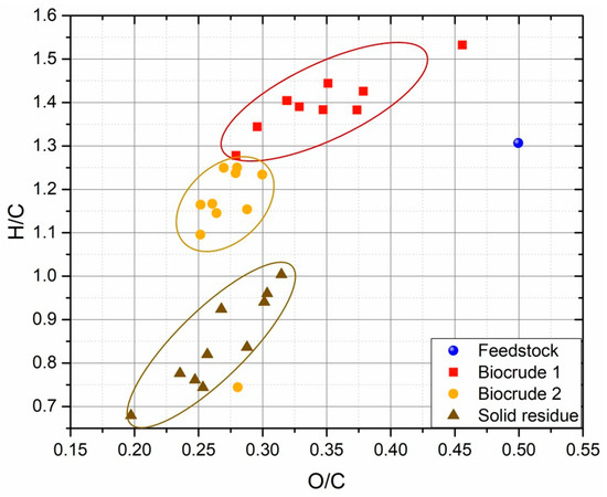 35], concerning HTL of lignocellulosic biomass. The decrease in the O/C and the increase in the H/C ratio of BC1 with respect to the feedstock suggest that the production of light biocrude was mainly due to decarboxylation rather than dehydration, which, on the contrary, was more evident for the production of BC2 and the solid residues.