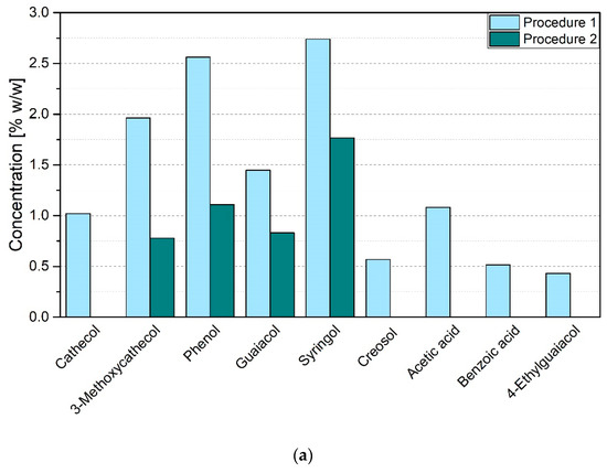 Figure 3 reports the effects of the collection procedure on the composition of the light biocrude fraction (biocrude 1) and on the aqueous phase obtained from an experiment performed at 350 °C, 10 min, 10%. It is clearly visible that by using Procedure 1, the light biocrude has a higher amount of organics and, in particular, catechol, creosol, acetic acid, benzoic acid and 4-ethylguaiacol are under the detection limit in the case of Procedure 2. Accordingly, in the aqueous phase, the situation is reversed: a greater concentration of organics is obtained in the sample collected through the Procedure 2; this is true for all the calibrated compounds, except for lactic acid, glycerol and glycolic acid, whose concentrations are comparable. In addition,