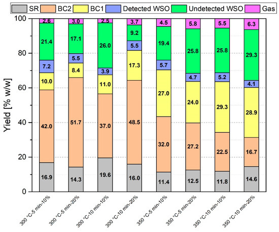 w, with the amount of light and heavy fraction changing with reaction conditions. In general, by increasing the reaction temperature, an increase in the yield of BC1 and a decrease in that of BC2 are observed, while the solid residue is approximately constant throughout all operating conditions, being char yields between 11.4% and 19.6%