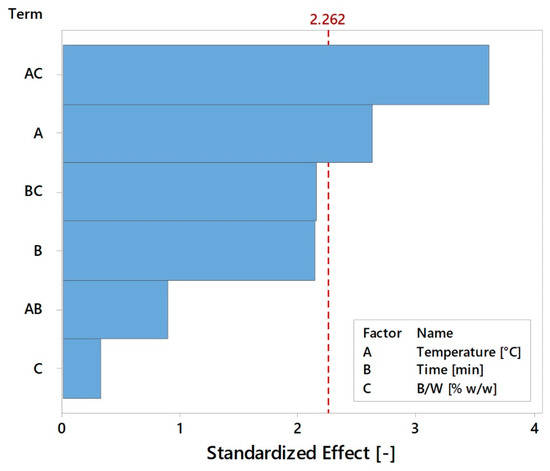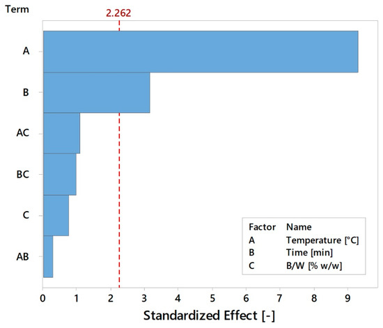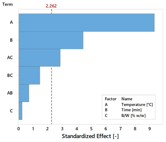Figure 7), the most significant factor is the interaction between temperature and B/W, followed by temperature. In this case, time is not significant, suggesting that, in order to detect a statistically significant effect, longer residence time should be investigated. This effect demonstrates that increasing (or decreasing) the biomass content together with a variation in the reaction temperature drive the degradation reactions that form the biocrude (e.g., phenols, methoxyphenols and longer oxygenated aromatics chains). In general, this means that, if the objective is to optimize the process in terms of total biocrude yield without considering its quality, both of these factors have to be jointly taken into account.