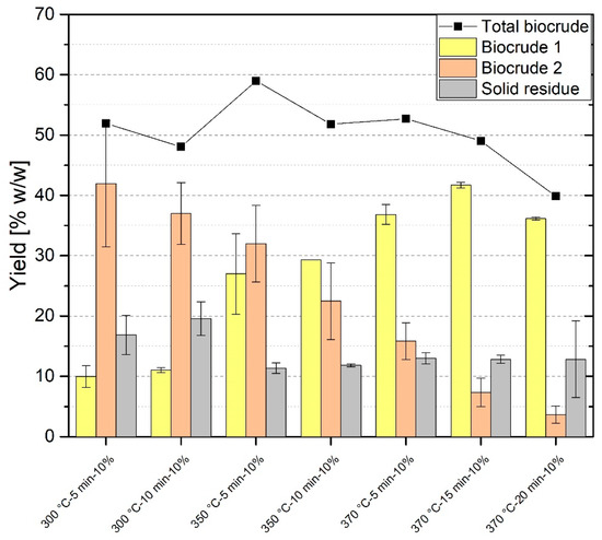 w. The maximum total biocrude yield was achieved at 300 °C, 10 min, 20% but nearly 74% of it was composed by BC2. At 350 °C, 10 min, 10%, the total biocrude yield was 51.8%