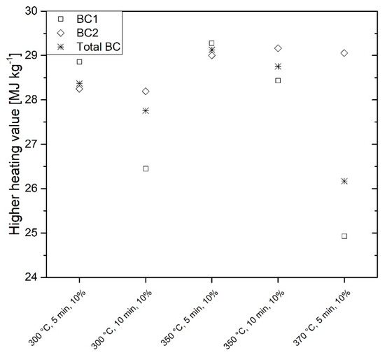 Figure 10). However, considering the total biocrude as the sum of BC1 and BC2, both yield and HHV reach a maximum at the same condition, i.e., 350 °C, 5 min, 10%, as the HHV of total biocrude is evaluated as a yield-based weight-average from that of BC1 and BC2.