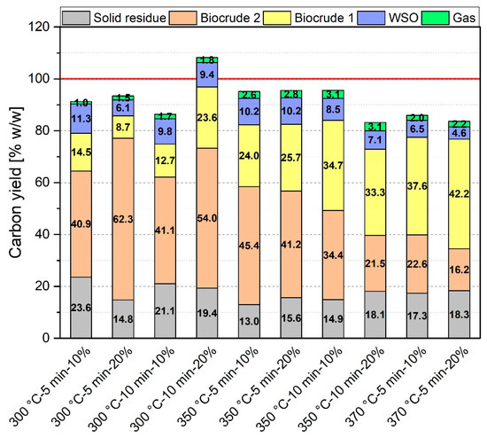 Figure 4 shows the yield of the HTL products, which were obtained at the operating conditions selected according to the experimental plan. The unidentified WSO were evaluated by difference and take into account also the losses due to the collection procedure.