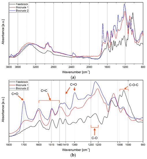 Figure 12). If compared with the feedstock, biocrudes exhibit a decrease in intensity at 1000–1070 cm