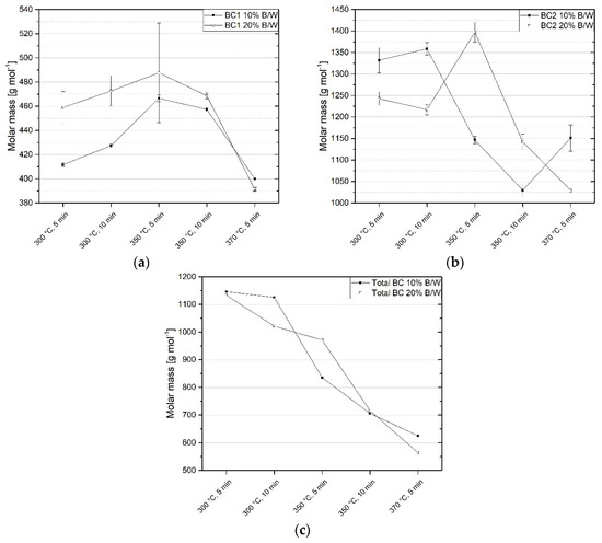 w of the total biocrude was determined as a yield-based weight-average from that of BC1 and BC2. Concerning BC1, a higher B/W, in general, produces a higher molar mass. An increase with residence time is shown at 300 °C, while an opposite behavior is reported at 350 °C. A maximum is reached at 350 °C, 5 min, both at 10% and 20%