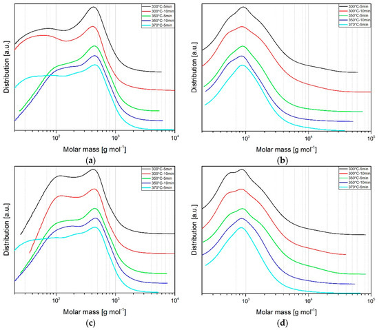 −1), which disappears at 350 °C and reappears, even with a slightly different shape, at 370 °C, confirming the presence of a maximum. On the contrary, the molar masses of the heavy biocrudes are more homogeneous, as confirmed by the lower PDI. Considering the BC1 samples obtained at a B/W of 20%, at 300 °C they still exhibit a low-molecular-weight peak, but, in this case, it is narrower and shifted towards higher values, precisely between 100 and 200 g mol