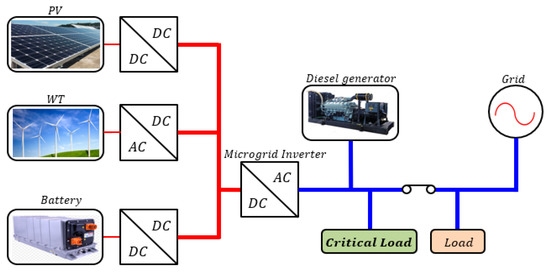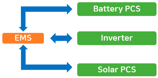 Figure 1 shows a block diagram of a microgrid system. When the microgrid operates in the standalone operation mode, it establishes a small-scale power grid by linking with various renewable energy sources (based on the energy storage system), and supplies stable electric energy to the demand load. A number of power conversion systems (PCSs) are needed in microgrid systems in order to link the renewable energy, grid, battery, and diesel generator. Typical PCS’s include a device to convert renewable energy to DC, a bidirectional DC–DC converter to charge/discharge the battery, and a microgrid inverter to convert DC to AC. As the microgrid system has a plurality of power conversion devices, it is very important to define a communication method between them. Generally, for module design, each PCS is designed to have a separate controller, and the master controller—the energy management system (EMS)—communicates with all of the power converters to design the control. Figure 2 shows a block diagram of communication in a microgrid system [8,9,10].