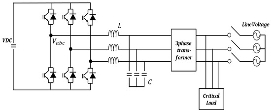 where, is the phase voltage of the inverter side, is the filter capacitor voltage, is the inductor voltage, is the inductor current, is the capacitor current, and is the load current. For an easy analysis, the turn ratio of the transformer is assumed as the ideal transformer with a 1: 1 turn ratio, and the load is assumed to be the only resistor load. Equations (1) and (2) are the state average models for the inductors and capacitors of the typical three-phase inverters. The AC three-phase system cannot use proportional-integral (PI) controllers. Therefore, to design the controller, the voltage and current of the abc axis are converted to the dq axis.