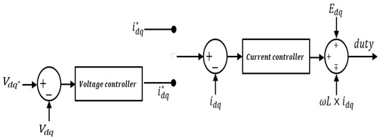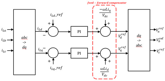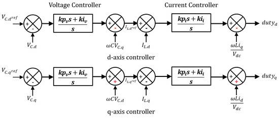 Equations (6) and (7) are the state average model for the dq axis of the voltage and current, respectively, of the inverter. There is a cross-coupling term in the dq axis of the voltage and current. As this cross-coupling term complicates the controller design, it is removed by the feed-forward compensation, as shown in Figure 4.