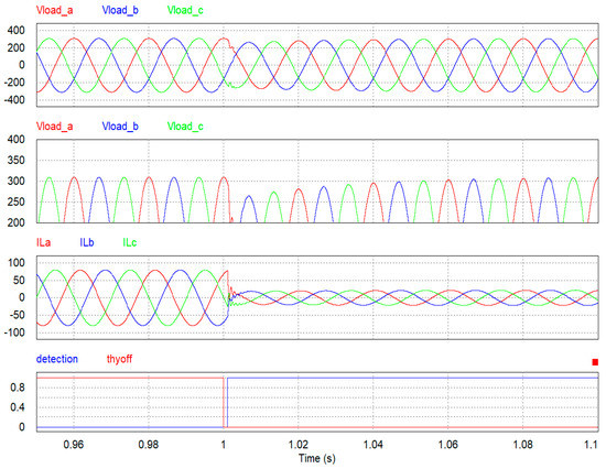 Figure 8 shows the simulation result of a mode conversion as a result of the occurrence of a system fault. Here, it is assumed that the switch connected to the system turned off because of a fault—this change was detected within 1 ms, to trigger mode conversion. At this time, the inverter proceeded to control the voltage in standalone mode. However, a transient occurred in the output voltage after the mode change. Secondly, there is a weak-grid fault. A weak-grid fault occurs when the grid voltage is lower or higher than the rated voltage because of grid disturbances. The inverter senses a fault when the grid voltage is unstable below or above the rated-voltage (weak-grid fault), and switches modes from the grid-connected mode to stand-alone mode.