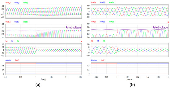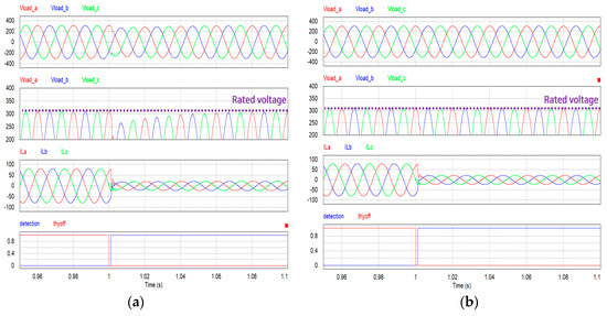 Simulation results of mode switching in the case of a grid fault during renewable energy generation: (a) using the general inverter controller; (b) using the proposed load current compensation controller.