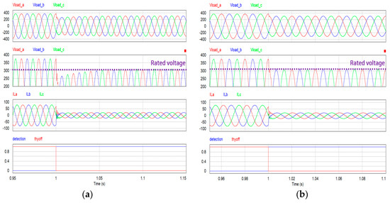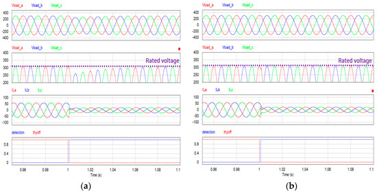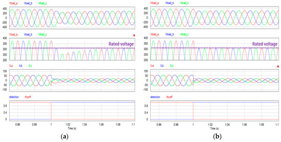 Simulation results of mode switching in the case of low-grid voltage during renewable energy generation: (a) using the general inverter controller; (b) using the proposed load current compensation controller.