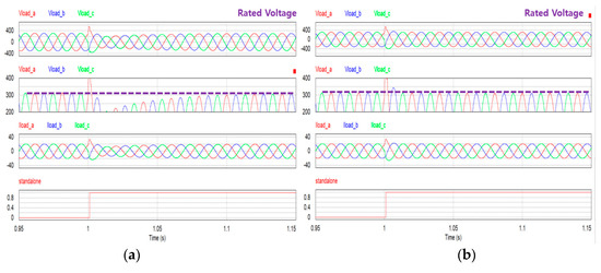 Figure 18 shows the simulation results of the output voltage and current according to load variations, when the inverters operate in standalone mode. Figure 18a shows the case in which the general controller was used. When the load fluctuated, the output voltage fluctuated. The results showed that the output voltage fluctuated by approximately 60 V. However, when the controller that compensates the load current was used, as shown in Figure 18b, a stable voltage was always output—even if the load fluctuated. When the microgrid inverter is in standalone mode, it acts as a voltage source and is responsible for supplying power to the demand load. Therefore, if the proposed controller is used, it will have robust characteristics against demand load fluctuations.