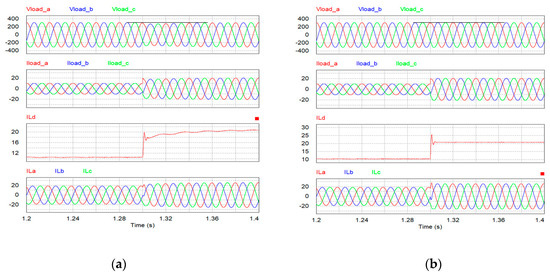 Simulation results of mode switching in case of a load change in a weak-grid condition: (a) using the general inverter controller; (b) using the proposed load current compensation controller.