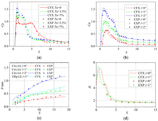 Verification of the simulation: (a) Cp of different turbulence values for Circ.LE; (b) Cp of different incidences for Ellip.LE at Tu=5%; (c) the momentum boundary layer thickness for Circ.LE and Ellip.LE at Tu = 5%; (d) Shape factor for Circ.LE at Tu = 5%.