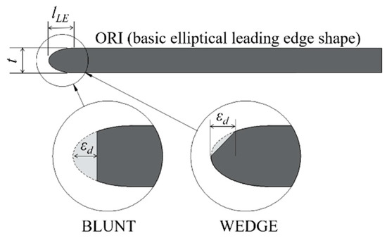 The basic leading edge shape is an ellipse with a ratio of 1.89 [2] (named ORI, which is also applied in Section 3.3). In order to analyze the influence of the leading edge deformations, blunt and wedge deformations are manufactured, as shown in Figure 3. BLUNT is a cut vertical to the axis of symmetry at the nose of the leading edge. WEDGE is a cut between the nose and a certain point at the leading edge surface. The deformations level ε, defined in Equation (5), is 2%, 6% or 10%. These two kinds of deformations were used to simulate the damage caused by external factors in manufacturing and working.