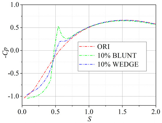 Figure 21 to Figure 23 show that CL-WEDGE has an excellent aerodynamic performance. Similar research has been investigated by Lu Hongzhi [43,44]. She improved a circular leading edge design with a tiny flat, as shown in Figure 24. The double suction spikes on the flat edges were much weaker than the single spike that appeared on a circular leading edge. Therefore, the loss of the boundary layer was reduced.