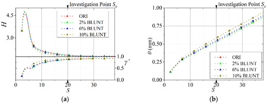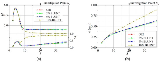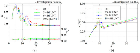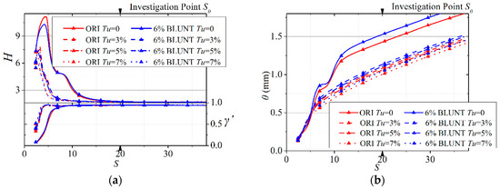 Figure 13 shows the result of ORI and 6% BLUNT at i = 2 deg. For ORI, at Tu = 0, the leading edge separation is extra strong. The Hmax amounts to 11.2 and the reattachment point is at S = 10.14. At S0, θ reaches 1.43 mm. For 6% BLUNT, the Hmax amounts to 10.41 and θ reaches 1.52 mm (+0.09 mm) at S0. With the turbulent inlet, the Hmax and θ decrease obviously, indicating that a short transitional separation bubble occurs, which is similar to the condition at i = 0 deg and Tu = 7%. As expected, the deformation influence is also similar to that condition. Taking the result at Tu = 3% as an example, for ORI, the Hmax amounts to 7.88, and the reattachment point is at S = 5.47. At S0, θ reaches 1.427 mm. For the 6% BLUNT, the Hmax amounts to 7.46 and the reattachment point is at S = 5.51. At S0, θ reaches 1.525 mm (+0.1 mm).