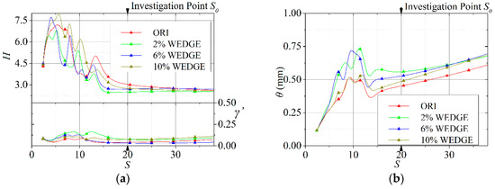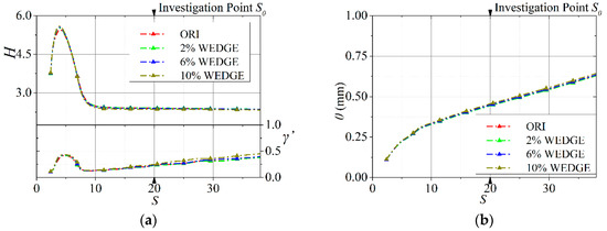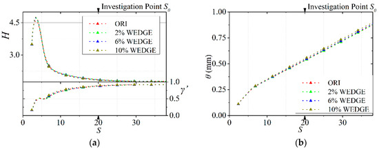 The BLUNT series promotes the transition process and suppresses separation. For 2% BLUNT, the reattachment point is put forward to S = 12.3. At S0, θ reaches 0.455 mm and γ’ achieves 0.106 (+0.065). Unexpectedly, the WEDGE series leads to stronger separation, as shown in Figure 6. For 2% WEDGE, the reattachment point is at S = 13.99, at S0, θ achieves 0.559 mm (+0.107 mm), which is obviously higher than the others. It should be noted that for all leading edges, after reattachment, θ with a higher γ’ increases faster (this rule applies to other computation conditions).