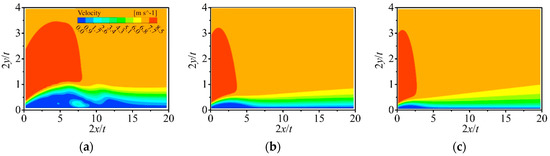 The velocity contour near the leading edge area of the basic elliptical shape at different turbulence values: (a) At Tu = 0; (b) At Tu = 5%; (c) At Tu = 7%.