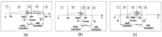 It should be noted that instead of free-stream turbulence, the separation bubble and transition process both decide the influence mechanism. These two questions have captured researchers’ attention for decades [34,35,36,37,38]. Hatman and Wang [35] distinguished the separation bubble as three modes, shown in Figure 12. The scale of the separation bubble and transition speed has a negative correlation. It is very meaningful that there is a one-to-one correspondence between Figure 11 and Figure 12. In other words, different influence mechanisms are only suited to different separation modes.