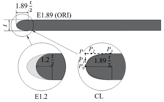 In order to investigate the sensitivity of different leading edge shapes, apart from the involved elliptical leading edge, named E1.89 in this subsection, another two series are added to the research, as shown in Figure 14. One is an elliptical leading edge with a ratio of 1.2, named E1.2. The other one is a continuous curvature leading edge with a ratio of 1.89, named CL. The continuous curvature design uses the three-order Bézier curve [39]. The design principle is to ensure that the wall curvature is continuous at the tangent point and to keep the shape as similar to E1.89 as possible. The results show that the continuous curvature design could not perform better than E1.89, which is opposite to the previous research articles [8] (a real blade always has a positive wedge angle and larger leading edge length). However, it is still significant to compare and help summarize the sensitivity rules of different leading edge shapes.