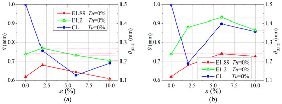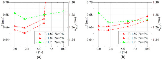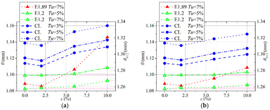The low turbulence condition is shown in Figure 15. It should be especially explained that in the following figures, there are two vertical axes both in the left and right because the θ of E1.2 is much higher than others and, thus, it is based on the right-side vertical axis. At the same time, the increments of the two axes are the same in order to reflect the deformation influence. For the E1.89 series, the BLUNT makes the profile loss increase and then decline. The greatest change occurs at ε = 2% and θ grows by 10.19% (+0.063 mm). The smallest influence occurs at ε = 10% and θ decreases by 1.7% (–0.011 mm).