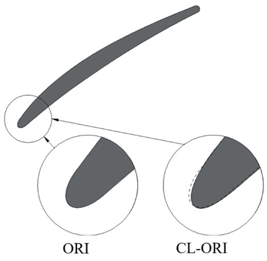 Table 1 depicts the cascade physical parameters. The blade is designed by the National Key Laboratory of Science and Technology on Aero-Engine Aero-Thermodynamics, Beihang University. The leading edge includes two original shapes. One is an ellipse with a ratio of 1.89; the other is an integrated design with a continuous curvature, as shown in Figure 18. Owing to the larger wedge angle and leading edge length, the integrated design performs better than an ellipse for the disappearance of the leading edge separation. The deformations include the BLUNT and WEDGE of ε = 2%, as Table 2 describes. It ensures there is no influence on blade load.