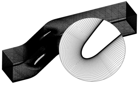 CFX-12.0 is used for numerical simulations. The SST turbulence model and gamma-theta transition model are used similarly for flat plate computation. The type of the mesh is also H-O-H, and there are two layers of the O-type mesh surrounding the blade with local refinement. The convergence of the mesh was investigated similar to the flat plate. The total number of nodes amounts to around five million, as shown in Figure 19. The simulation used the total pressure inlet and static pressure outlet as the boundary condition. The inlet total pressure and free-stream turbulence were the same as that of the experiments. The outlet static pressure was atmospheric pressure.
