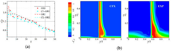 The verification of the simulation: (a) Cp distribution among the suction surface at 0.5 height of CL-ORI at Tu = 2.5%, Ret = 2500; (b) Cp contour at 1.1 chord length exit.