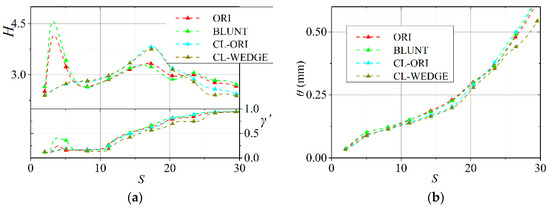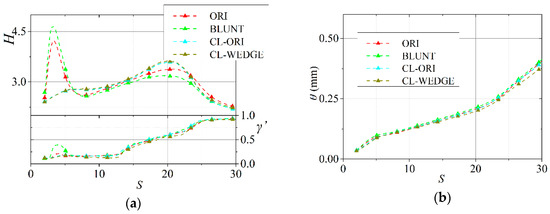 It should be noted that after S0, there is no difference among γ’ in all the series, but deformations also accelerate the increase of θ. This means that ∆θ keeps growing as the boundary layer develops downstream. For instance, the γ’ of ORI and 10% BLUNT both stay at 0.87 after S0, while at S0, ∆θ is 0.052 mm and at S = 40, ∆θ increases to 0.063 mm.