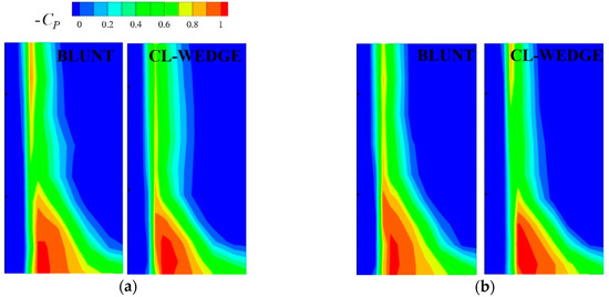 Figure 23 shows the Cp (defined in Equation (1)) contours at the 1.1 chord length exit of the BLUNT and CL-WEDGE, as the biggest difference in the four leading edge shapes. The contour of ORI is very close to BLUNT and the contour of CL-ORI is very close to the CL-WEDGE’s. Contours reflect the scale of corner separations. It can be seen that BLUNT is larger than CL-WEDGE, which means the trailing edge separation of BLUNT is larger than CL-WEDGE’s at a 0.05 blade length. Therefore, it can be inferred that the velocity profile penalty caused by leading edge deformation is retained afterwards in the downstream in the suction surface boundary layer. Besides, it reflects that the Reynolds number has few influences.