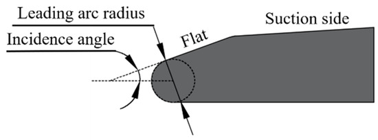 Non-designed deformations such as fabrication tolerances, blade degradations and maintenance, repair and overhaul (MRO) processes of the blade’s leading edge geometry always leads to a loss increase, and thus attracts researchers’ attention. Blunt is the most common type [14], which makes the efficiency drop significantly [14,15]. The sensitivity of the leading edge is also studied, proving that small geometrical changes have a linear or second order influence [16,17].