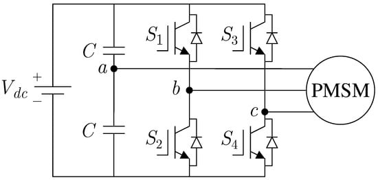 FSTP inverter control topologies have been adapted to both sensored and sensorless PMSM and brushless DC (BLDC) drives in [17,18,19,20,21,22,23,24,25,26,27,28,29,30,31,32,33,34,35,36,37,38,39,40,41,42,43,44,45,46,47,48,49,50,51,52,53,54,55,56,57,58,59,60,61,62,63,64]. FSTP inverter-based BLDC drive is firstly introduced in [17]. The improvement in speed control performance of [17] is achieved in [18]. In Ref. [19], one of the first attempts of PMSM speed control using an FSTP inverter is performed and compared with an SSTP inverter. In Ref. [20], the BLDC motor with three hall-effect position sensors driven by an FSTP inverter based on a novel current controlled PWM strategy with six commutation modes is proposed. To achieve low-cost sensorless BLDC position control, utilizing crossing detection of the two active phase voltage waveforms with an asymmetric voltage PWM method based on [20] is presented in [21]. In Refs. [22,23,24,25], sensorless control methods for a BLDC drive using an FSTP inverter are reported. The position sensorless control of PMSM driven by an FSTP inverter is introduced in [26,27,28]. In [29], a direct torque control (DTC)-based BLDC motor driven by an FSTP inverter that employed a novel optimum switching table which enables the independent simultaneous control of the electromagnetic torques developed by the phases connected to the inverter legs without requiring explicit stator flux control is achieved. The operation of an FSTP inverter resembles the faulty one-leg of a traditional SSTP inverter. Recent research has focused on the reliability and fault tolerance of an SSTP inverter under faulty one-leg conditions to maintain the stable operation of the overall drive scheme. In Ref. [30], the proper operation of an induction motor driven by an SSTP inverter under a short-circuit fault in one-leg is accomplished without significant disturbance using a proposed fault isolation topology in which the inverter is reconfigured from six switches to only four switches. The faulty condition of an SSTP inverter resembling the operation of an FSTP inverter are investigated for PMSM drives using FOC and DTC schemes in [31,32,33,34,35,36,37,38]. Minimization of torque and current ripples incorporating space vector pulse width modulation (SVPWM) have been investigated for FSTP inverters. In the FSTP inverter, one phase is always attached to the uncontrolled center tap of the two DC-link capacitors; therefore, current waveforms are distorted and unbalanced. Compensation strategies for PMSM and BLDC drives are employed to overcome the current and torque distortion and unbalancing issues of FSTP inverter in [39,40,41,42,43,44,45]. Moreover, there have been efforts to reduce the number of current sensors from two to one in FSTP inverter driven PMSM and BLDC drives in [25,46,47]. Intelligent control methods such as fuzzy-logic and ANN type controller strategies have been proposed for FSTP driven PMSM and BLDC drives in [48,49,50,51,52]. BLDC drives using FSTP inverters with power factor correction (PFC) have been presented in [53,54].