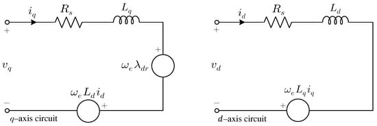 Equivalent electrical circuit diagram of the permanent magnet synchronous machine (PMSM) in -axes synchronous reference frame [70,71,72].