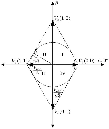 As opposed to the classical six-switch three-phase (SSTP) inverter, where six non-zero and two-zero voltage vectors exist, only four active non-zero voltage space vectors and no zero voltage vectors are available in FSTP inverters, as shown in Figure 4 where phase-a is connected to the centre-tap, as illustrated in Figure 2. Compared to the six-switch counterpart, since each vector is aligned to an axis, vector representations are simple in FSTP inverter topology enabling more easier space vector pulse width modulation (SVPWM) strategy. Maximum line to neutral voltage is and can be used to normalize the space vectors and . In the structure of the SVPWM switching method for the proposed FSTP inverter based sensorless scheme, the reference voltage vector in each sector can be represented with the two closest voltage space vectors and zero voltage vectors in plane. For example, when the reference voltage resides in Sector I, two non-zero voltage vectors are and , and the zero voltage vector is obtained as the combination of the smallest vectors, and , in the timing diagram of the switching sequence. The time duration of and when the reference voltage vector is located in Sector I are obtained as