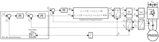 where , , , are the stator voltages and currents in frame, respectively; is the stator resistance; and represent the –axes inductances; denotes the rotor angular electrical speed; and are the -axes stator flux linkages in which and are the frame rotor flux linkages where is the permanent magnet flux linkage and [70,71,72]. For surface-mounted permanent magnet synchronous motor, where is the stator inductance of the surface-mounted PMSM.