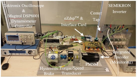 The experimental set-up consists of a hysteresis dynamometer set, an inverter, a PMSM with an optical incremental encoder integrated for monitoring purpose, an eZdsp® board (Spectrum Digital, Stafford, TX, USA) with a TMS320F28335 DSP chip, and an interface and signal conditioning cards. The voltage unbalancing is seriously increased when the capacitors are selected as small. The inverter generates a maximum 4.3 s dead-time and has two 2200 F caps. The value of the DC-link voltage is selected to be 565 V, which is the nominal PMSM DC-link voltage. Normally, the optimal value of DC bus voltage should be higher than 565 V in four-switch inverters to compensate for the reduction in power compared to a six-switch inverter case. The specifications and parameters of the PMSM are illustrated in Table A1 in the Appendix A.
