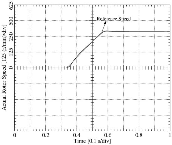 Experimental no-load ramp speed response (referenced 0 to 360 r/min in 2 s) without parameter detuning when (low).