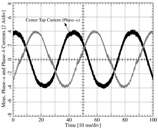 In Figure 9, the experimental steady-state phase-a and –b current waveforms are presented at 360 r/min under full load without parameter detuning when . As can be seen in Figure 7, Figure 8 and Figure 9, the proposed position sensorless method is able to drive the PM motor without any instability under full load injection and rejection assuming that there are no parameter variations in the PM motor when the K gain is chosen as 1. Due to slight misalignment and concentrated windings of the motor, phase currents show some harmonic signatures, as seen in Figure 9. Moreover, since the dead-time effect is not mitigated, the phase current waveform shows some additional distortion in particular at zero crossings and during positive and negative peaks. The effects of stator resistance and rotor flux linkage variations on the overall performance of the proposed drive are also investigated. The machine is run with external resistance under heavy load for a certain time until the PM rotor flux-linkage amplitude decreases 40% less than its original value. Because changing directly in the actual machine is a difficult task, the motor is heated up with external resistance under heavy load first to achieve 82.35% higher and 40% less ; then, the back-EMF constant and the final are measured afterwards. The resultant phase-a and -b axes current waveforms are shown in Figure 10 when both and PM rotor flux linkage values are detuned under full load (2 N·m). Although 90% higher currents are drawn by the motor as shown in Figure 10, which results in more losses than normal operation, the proposed position sensorless method is able to drive the PM motor even under multiple simultaneous high parameter variations without any stability problem.