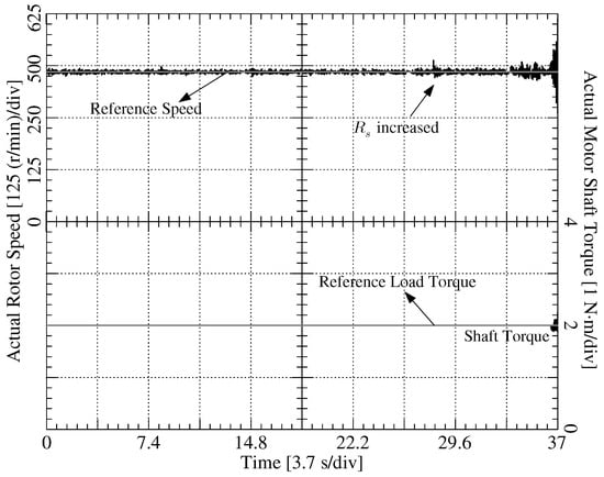 The nominal speed (900 r/min) full load steady-state experimental test while is increased by 82.35% and is decreased by 40% with (high) given in Figure 12 shows a non-oscillatory stable speed response. Moreover, an experimental low speed steady-state (90 r/min) speed response is shown in Figure 13a where full load (2 N·m) rejection is performed at s and full load injection is applied at s, while is increased by 82.35% and 40% less rotor flux linkage compared to the actual value with (high). This is the lowest stable speed under full load injection and rejection with heavy parameter detuning.