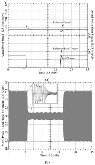 (a) Experimental transient and steady-state low speed (90 r/min); (b) phase currents’ response when full load (2 N·m) rejection and injection are performed at s and s respectively with (high) while is increased by 82.35% and is decreased by 40%.